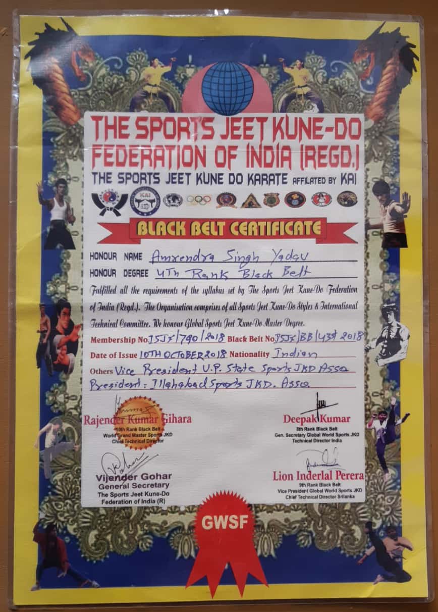 30 - Duration Of The Certificate Courses And Syllabus Are Not Rigid But Flexible. Abilities Of Students Are Not Known To Me. Some Take Years To Understand Little Things And Some Are Smart And Memorize Easily. When You Think You Are Ready For The Test, Appear For The Test. Participating, Fighting And Winning In Martial Arts Championships Are Not Mandatory Rather Optional. Black Belt Certificate Authorizes You To Impart Training Professionally And Earn Respect And Money Both. There Is A Discipline In Training And I Have Upgraded The Training To Match Only With The Best Of The Best In The Industry And Hence You Will Have To Earn The Rank, Belt And Certificates. Training Can Be Customized As Per The Requirement. “Sports Jeet Kune Do” Certificates Shall Be Issued By The “Sports Jeet Kune Do Federation Of India” Registered Only.